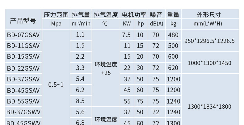 葆德無油水潤滑空壓機特點:純水潤滑,無油污,無需清洗等,型號:BD-07GSAV、BD-11GSAV、BD-15GSAV、BD-22GSAV、BD-37GSAV、BD-45GSAV、BD-55GSAV、BD-75GSAV、BD-90GSAV、BD-110GSAV、BD-132GSAV